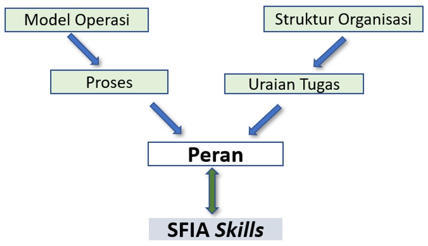 Dengan memperhatikan integrasi kerangka proses-proses bisnis, sasaran dan metrik proses, praktek dan aktifitas bisnis, serta peran dan relasinya, terlihat adanya hubungan kuat dengan ketrampilan dan level ketrampilan, level tanggung jawab dan akuntabilitas, serta kapabilitas siklus manajemen ketrampilan saat ini dan masa depan (Merriot, 2018). Berdasarkan hal tersebut, model integrasi SFIA dan Struktur Organisasi dan Tugas suatu perusahaan disusun dengan ketentuan (Gambar 5):