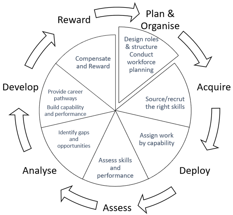 Menggunakan bahasa yang sama untuk memahami kemampuan tenaga kerja dan perencanaan pengembangan profesional memberikan struktur dan fokus untuk pengembangan keterampilan. Dan menggunakan bahasa dan struktur yang sama untuk pengembangan, konsistensi dapat diraih dalam sourcing dan penugasan pekerjaan, perencanaan pengembangan profesional, dan memahami kemampuan tenaga kerja.